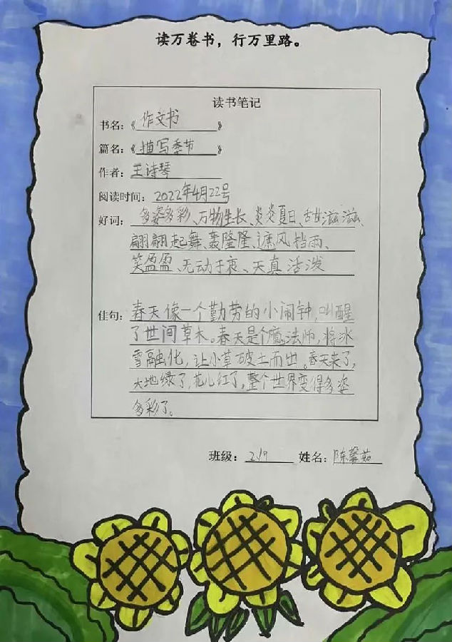 為進一(yī)步打造書(shū)香班級建設,拓寬學生(shēng)的知(zhī)識面,二年級語文組特組織“世界讀書(shū)日,我(wǒ)(wǒ)與書(shū)作伴”的讀書(shū)實踐活動。本次活動舉辦中(zhōng),同學們進行思想的碰撞,記錄下(xià)自己喜歡的片段,在留白(bái)處學生(shēng)用畫筆裝飾,繪制屬于自己的讀書(shū)筆記。彰顯新時代少年奮發向上,勵志(zhì)讀書(shū)的良好風貌。