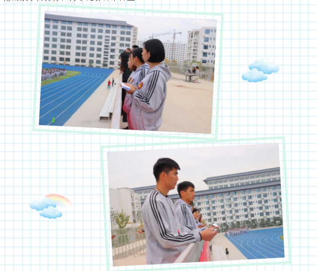 賽場上的同學們意氣風發,評委們更是認真負責,他們認真觀看每個班級隊列隊形的展示并打分(fēn),力求比賽公平公正。