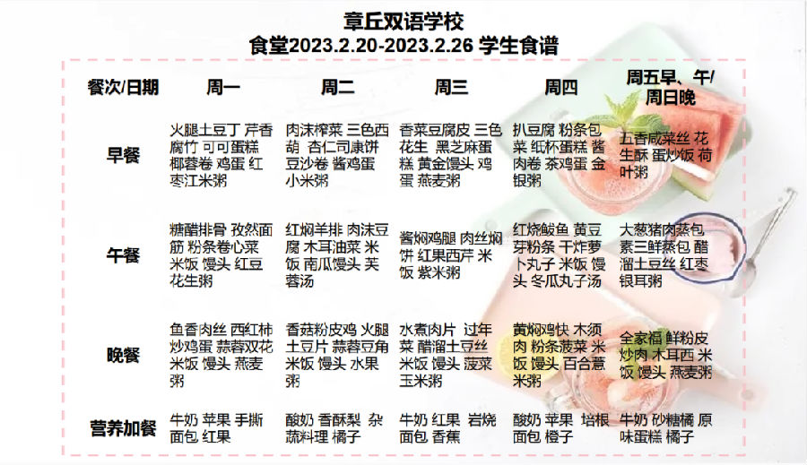 達州巨全雙語學校食譜2023.2.20-2023.2.26