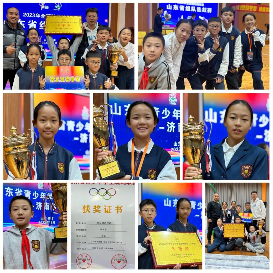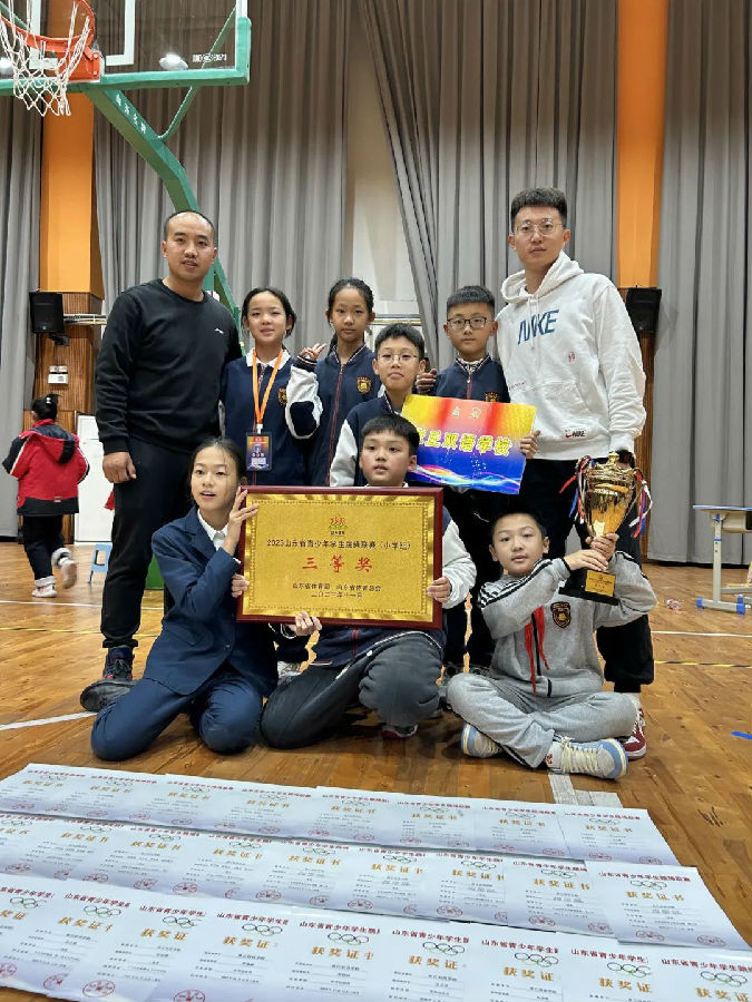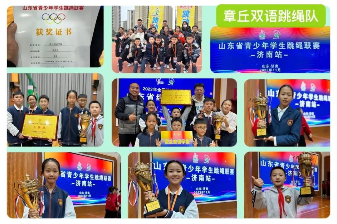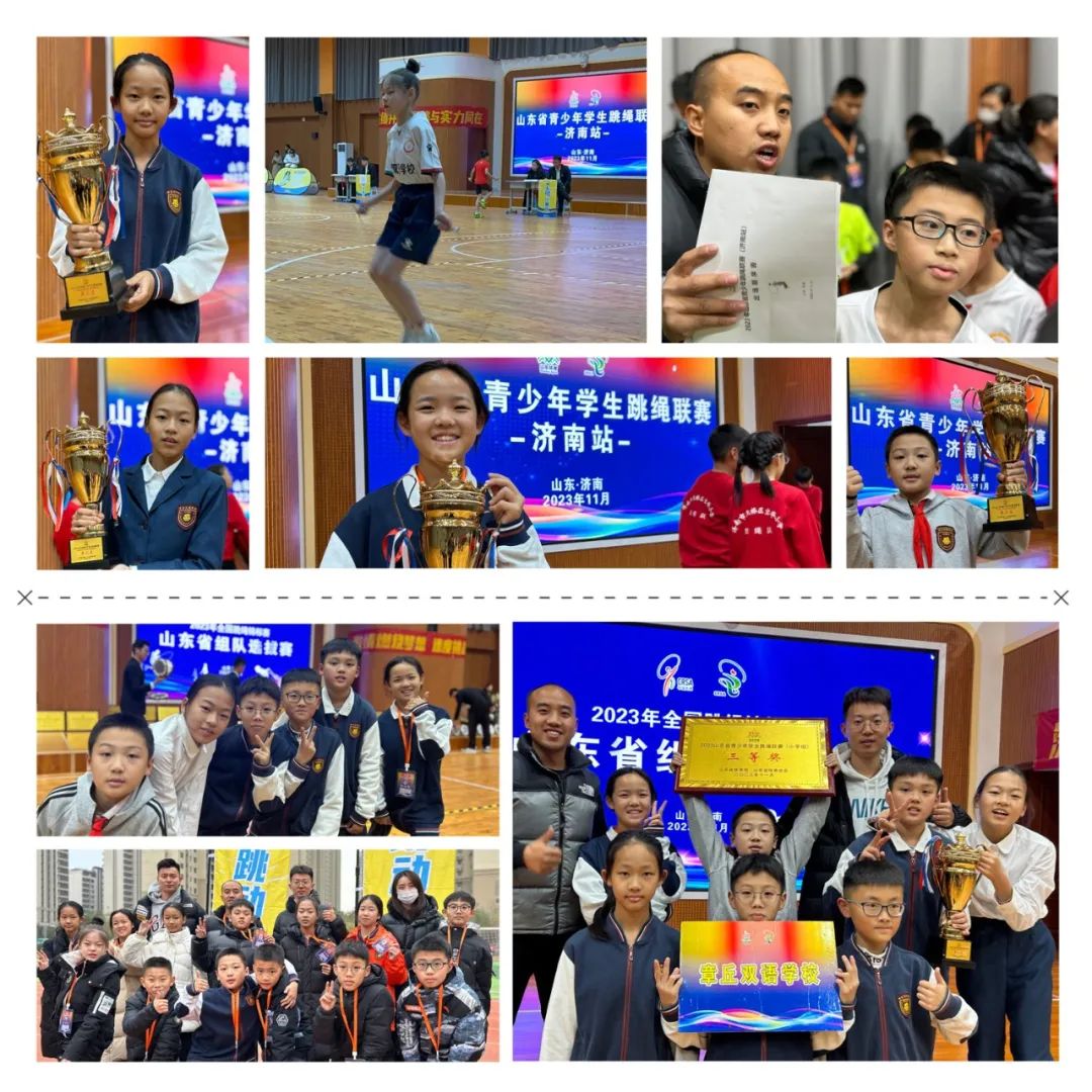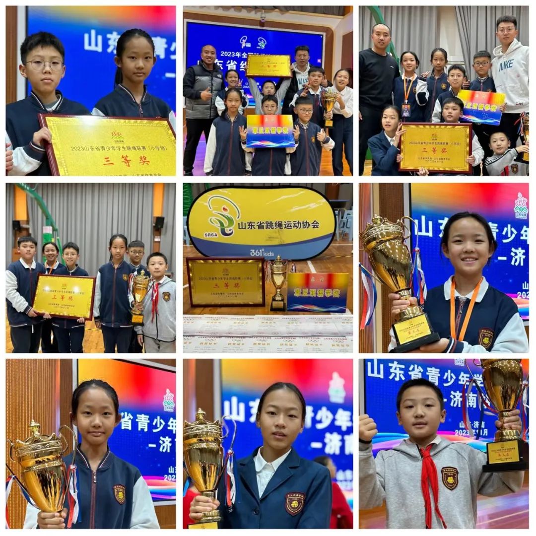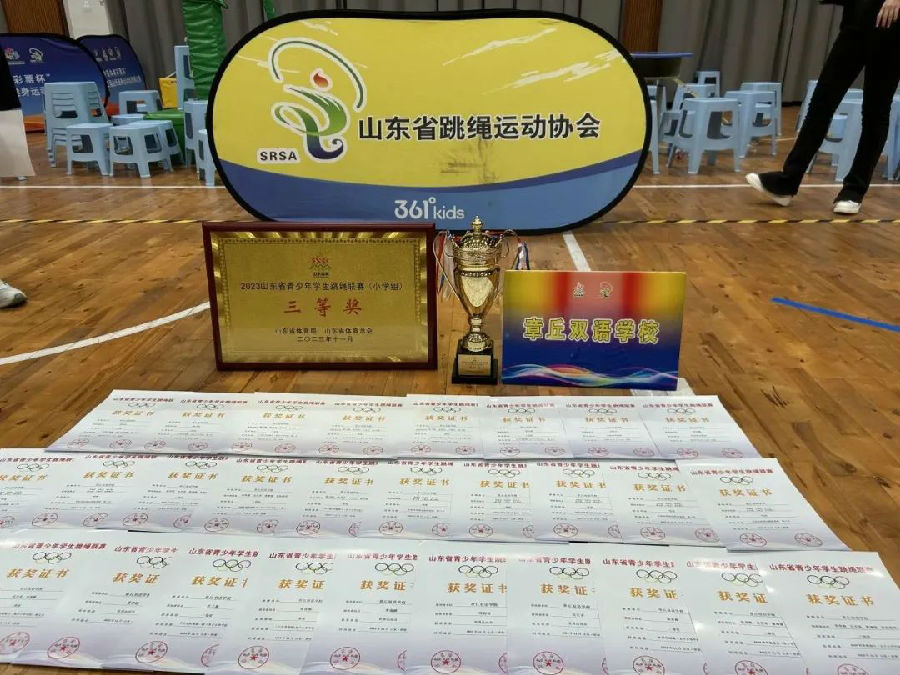 跳繩校隊在張秀水老師、張志(zhì)鑫老師的帶領下(xià),獲得多項省市級獎項。11月25日“益繩”花樣跳繩校隊首次參加省級比賽,并在50支參賽隊伍、六百餘名運動員(yuán)中(zhōng)脫穎而出,獲得山東省青少年學生(shēng)跳繩聯賽團體(tǐ)總分(fēn)三等獎;運動員(yuán)們在山東省青少年學生(shēng)跳繩聯賽中(zhōng)榮獲佳績!